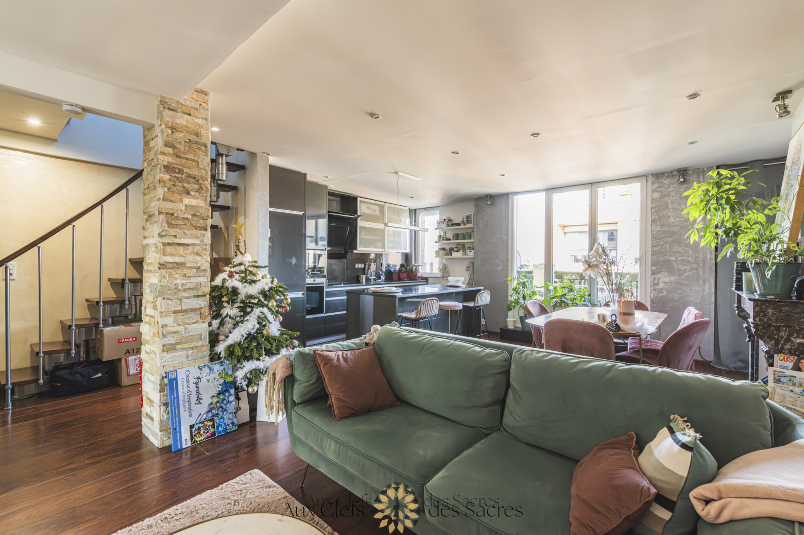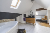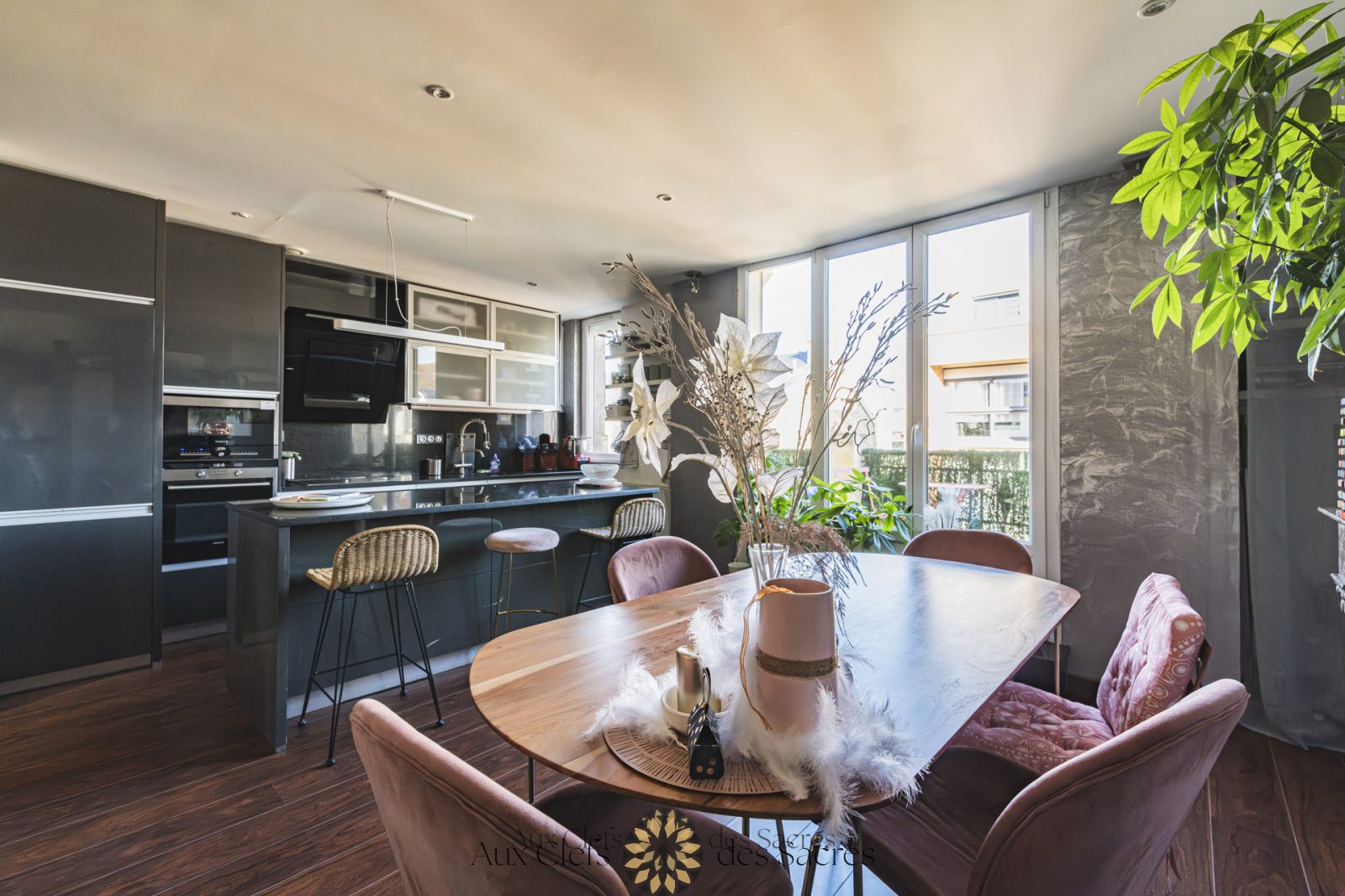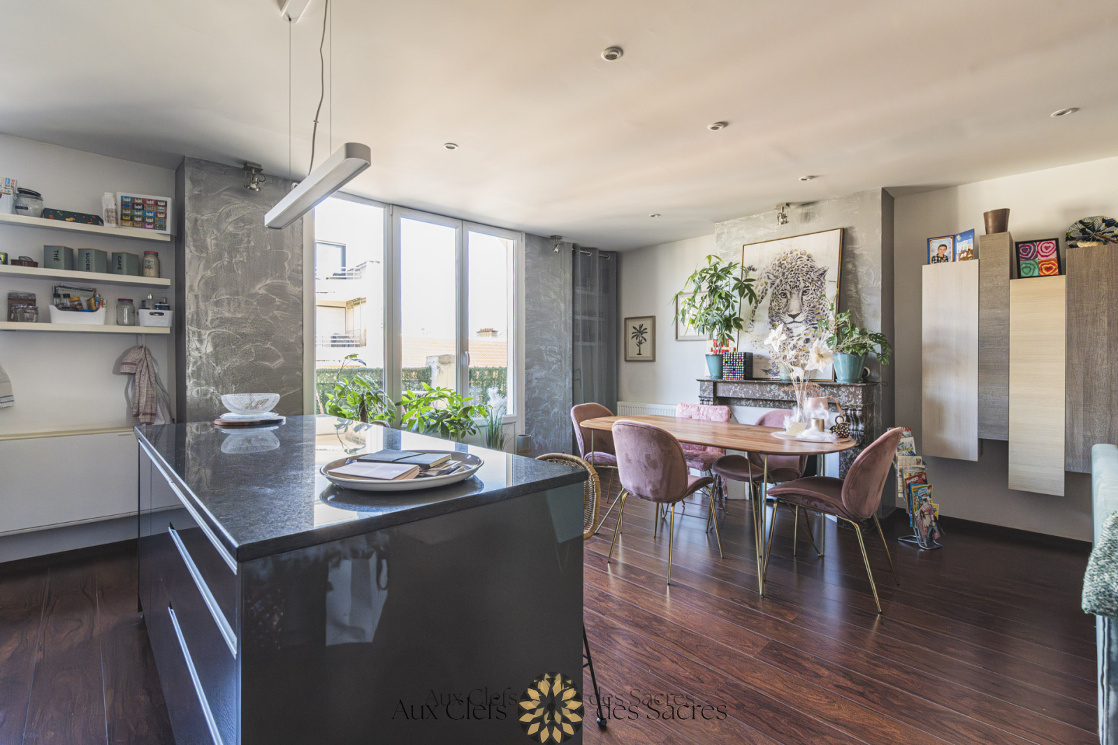 Le logement se compose d'une entrée, d'une grande pièce de vie avec séjour, salle à manger et cuisine ouverte, d'une terrasse, d'une salle de douches, d'une salle de bains, de deux WC et d'une 'un bureau.
