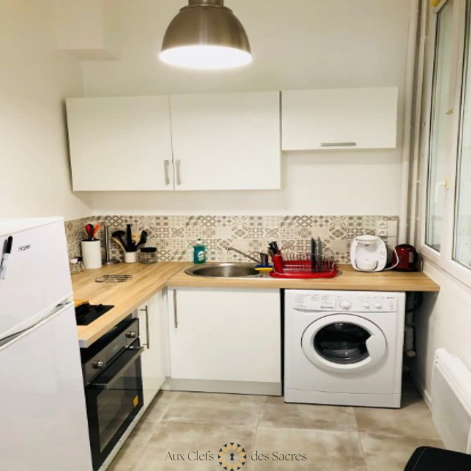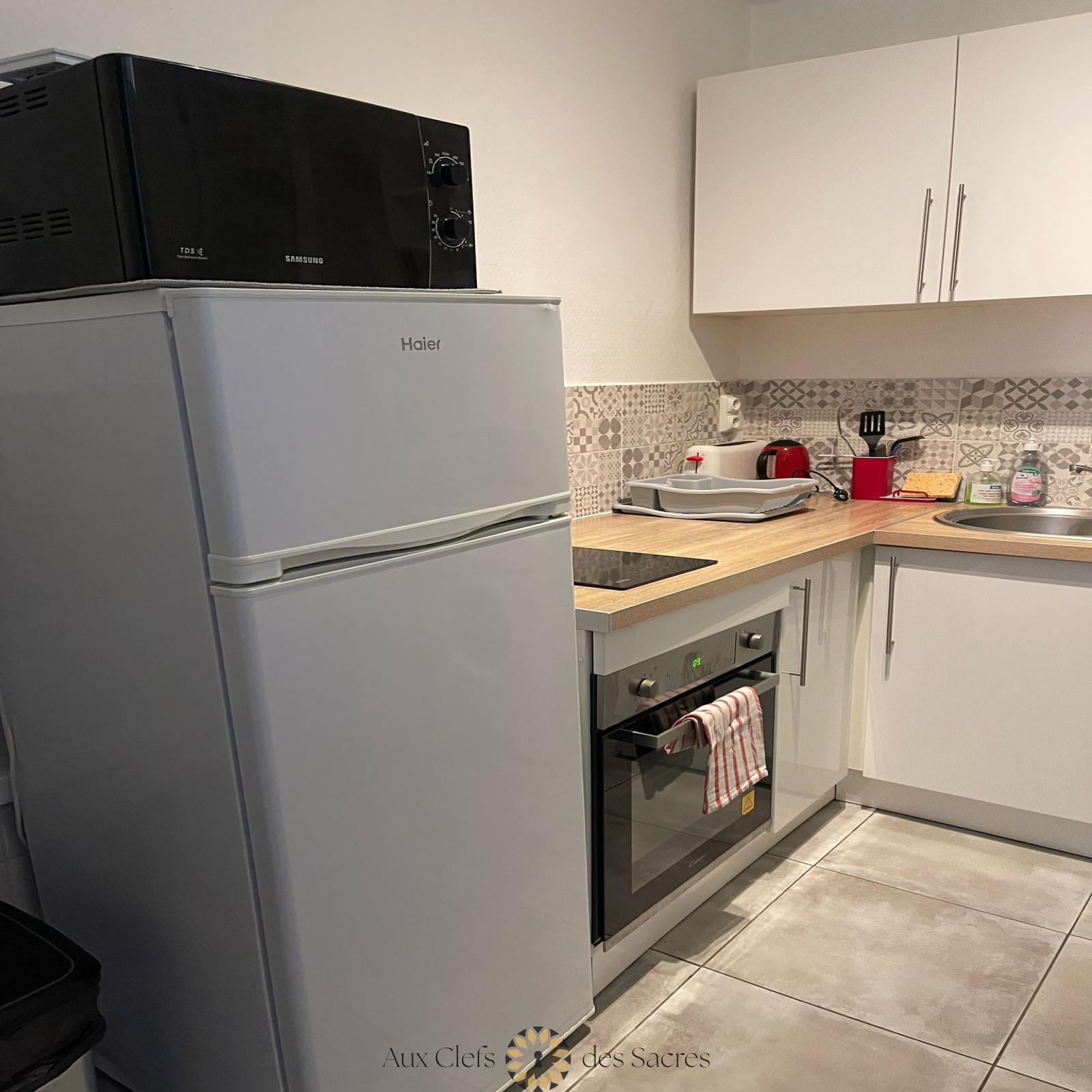La cuisine, ouverte et fonctionnelle, est équipée de tout le nécessaire pour préparer vos plats préférés : meubles de rangement, four, réfrigérateur, plaque de cuisson, bouilloire, cafetière, ainsi que tous les ustensiles de cuisine indispensables.