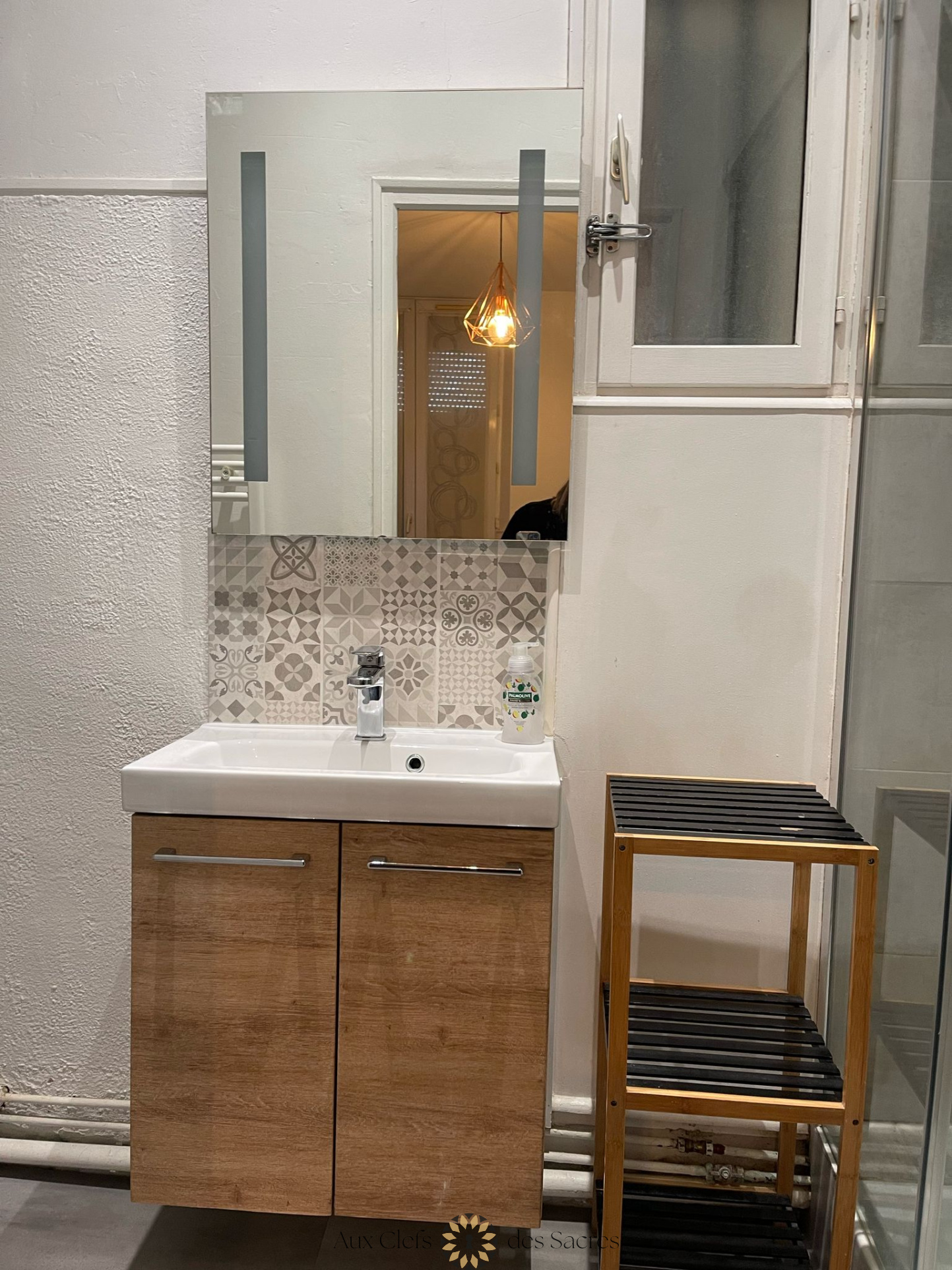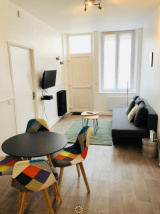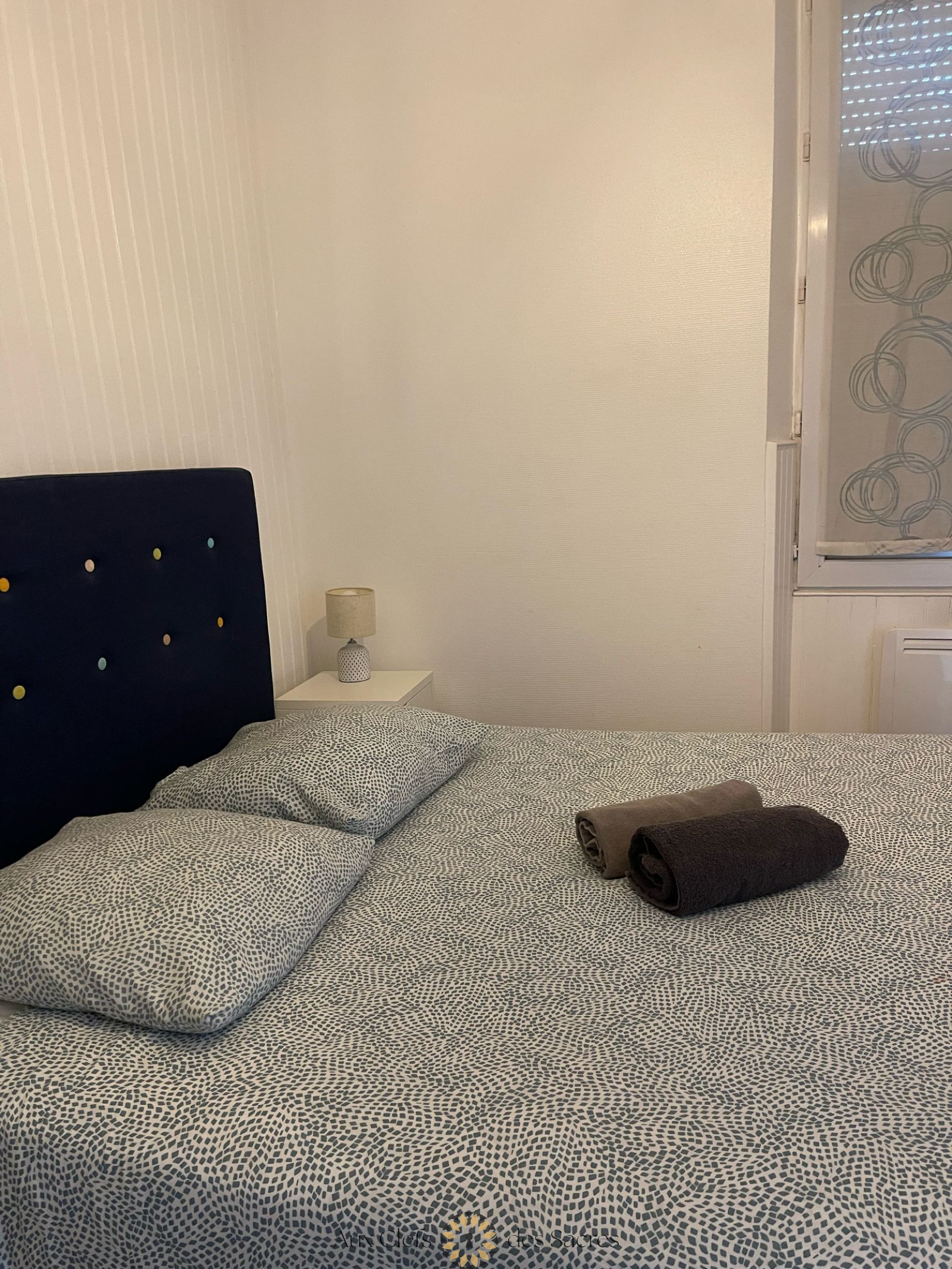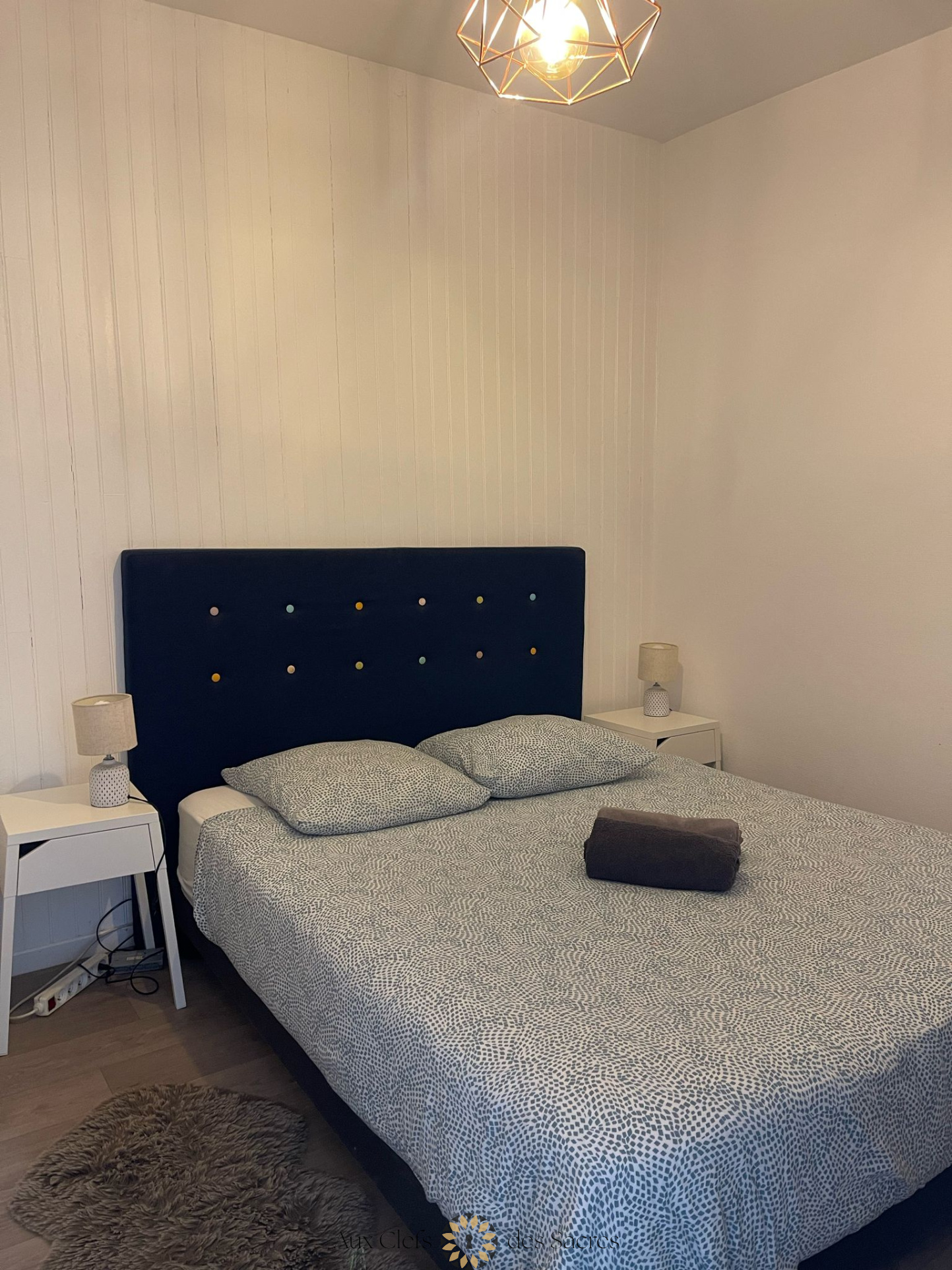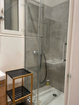 La chambre, cosy et reposante, dispose d’un lit double confortable et d’un espace de rangement pour vos effets personnels. La salle de bain moderne vous accueille avec une douche à l’italienne, un meuble de rangement et un miroir, le tout dans une atmosphère soignée. Les toilettes sont séparées pour plus de praticité.